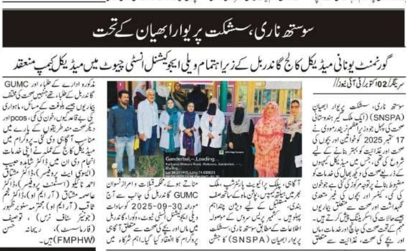 Celebrating Swasth Nari, Sashakt Parivar Abhiyaan (SNSPA) , a Maternal and Child Health Awareness programme was organised by the Department of Qabalat wa Amraz e Niswan GUMC Ganderbal at Sadaat Valley Educational Institute, Wakura, Ganderbal today on 30-09-2025.