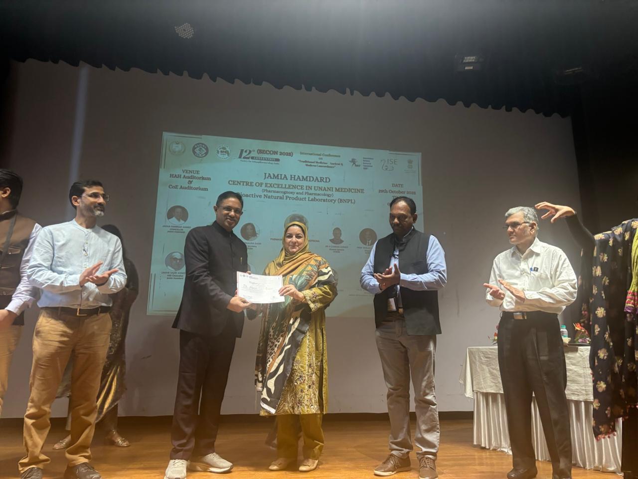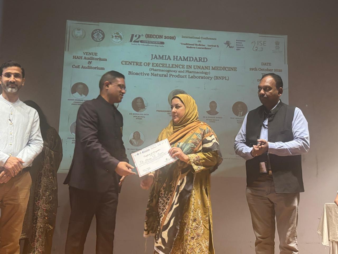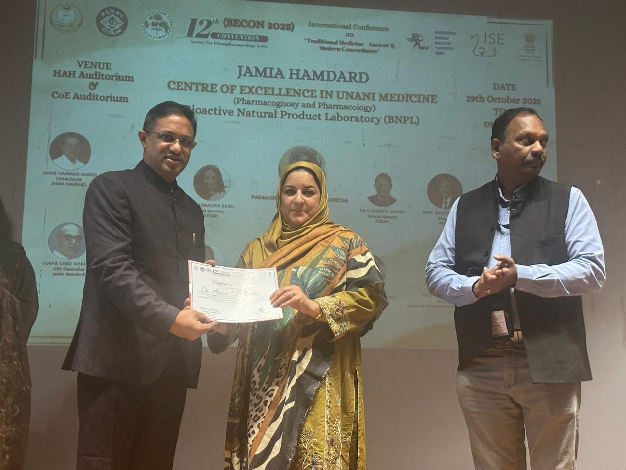 Dr Aasiyul Erum HoD Pharmacology GUMC, receiving certificate of recognition at International conference on Traditional Medicine- Ancient & Modern Concordance for presenting research paper on "hptlc chromatographic analysis on seeds of Tudri surkh" on 30 october 2025 organised by Hamdard University.